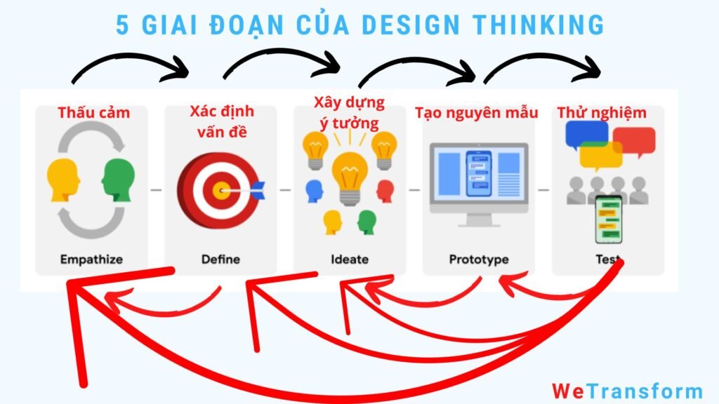 Design Thinking là một phương pháp tiếp cận sáng tạo, tập trung vào con người, được sử dụng để giải quyết các vấn đề phức tạp. Phương pháp này được chia thành 5 bước chính: